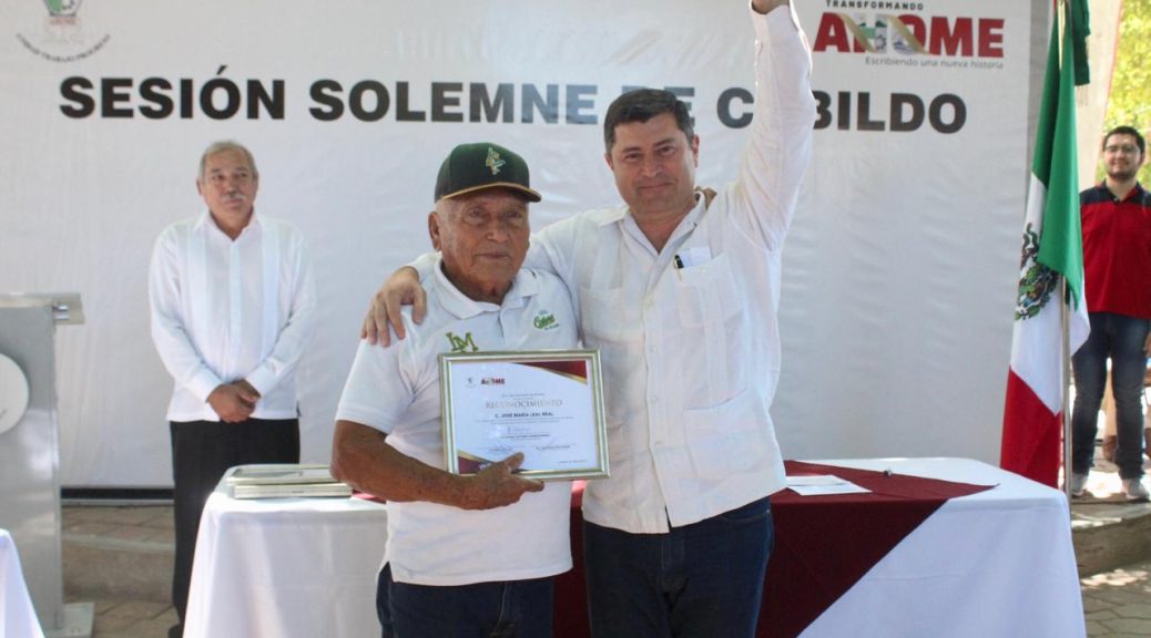 Sindicatura Heriberto Valdez Romero, Ahome, 1 de mayo de 2019 (IMDA).- El legendario exjugador profesional e ícono del béisbol en el municipio de Ahome, José María “Chema” Leal, recibió un merecido reconocimiento de manos del presidente municipal, Manuel Guillermo Chapman Moreno, durante la sesión solemne de cabildo que se desarrolló en esta sindicatura.