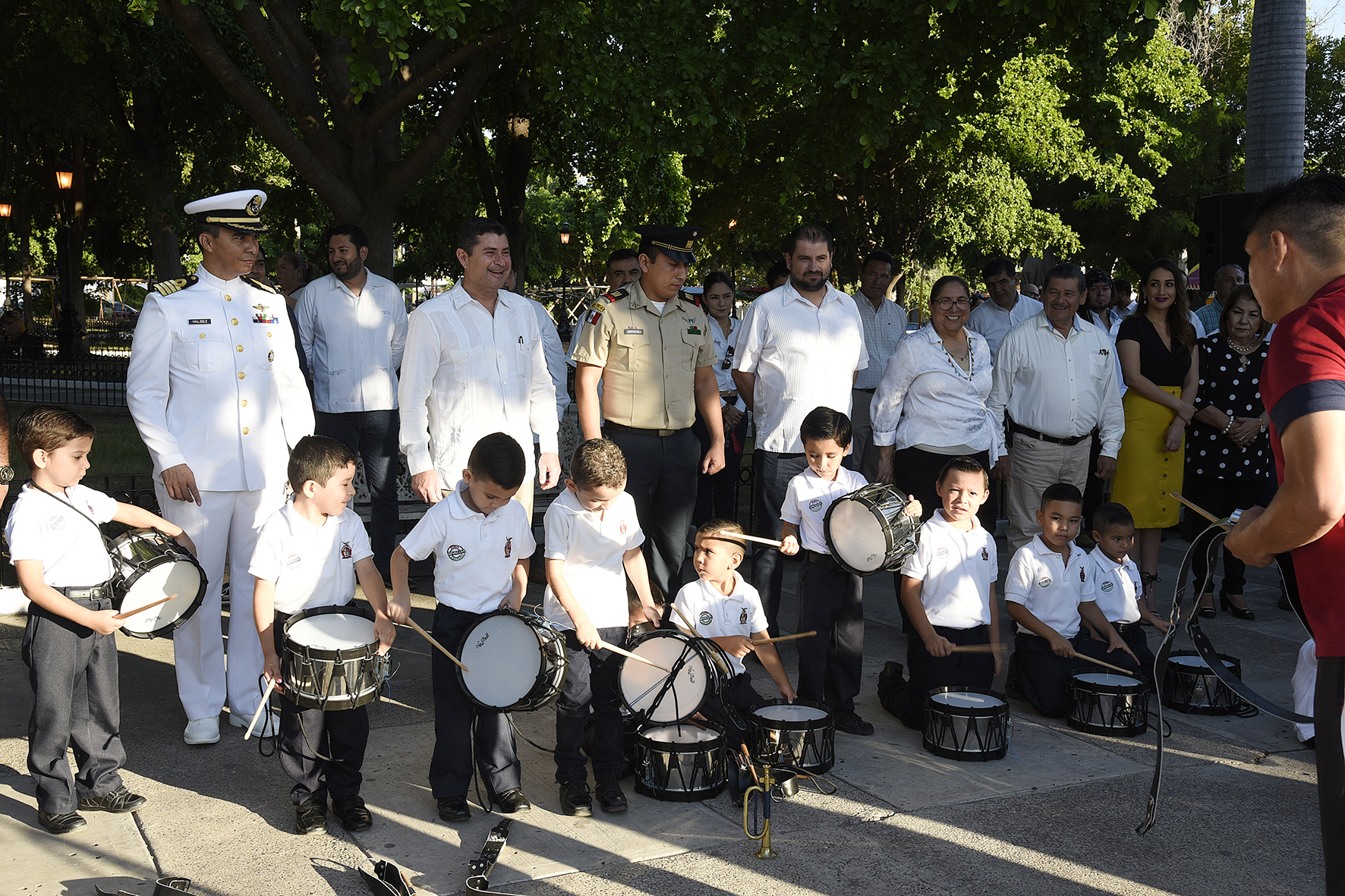 Ambas ceremonias estuvieron engalanadas con la participación de las escoltas y bandas de guerra del Sector Naval de Topolobampo, 89 Batallón de Infantería y de la Policía Municipal de Ahome.