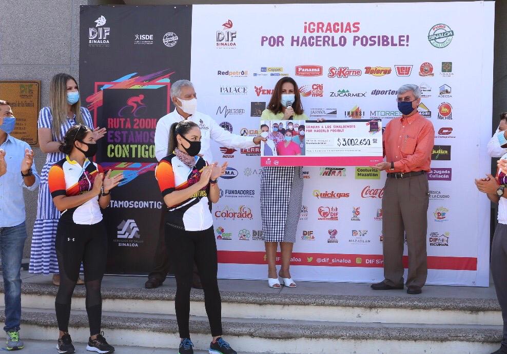 La presidenta de DIF Sinaloa agregó: “de verdad secretario con todo el corazón le hacemos esta entrega del cheque que es la suma del esfuerzo de todos estos ciclistas y de la ciudadanía que confío y que haremos patente luego de estos 3 millones 2 mil 650 pesos, que serán invertidos en equipamiento de protección para nuestros médicos, enfermeras, camilleros, que lo están necesitando y que sabemos que siguen en la primera línea de atención con nuestra gente que está padeciendo esta enfermedad”.