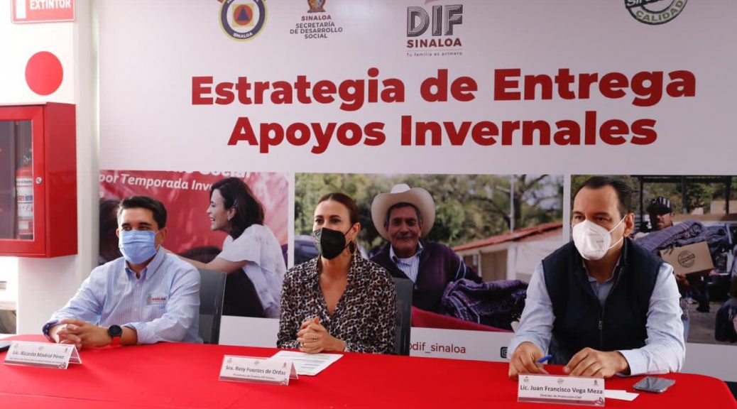 Mazatlán, Sinaloa, a 14 de diciembre de 2020.- Ante el descenso de las temperaturas que se están registrando en el estado, la Presidenta del Sistema DIF Sinaloa, Rosy Fuentes de Ordaz, el Secretario de Desarrollo Social, Ricardo Madrid y el Director de Protección Civil, Francisco Vega anunciaron la distribución de 45 mil apoyos invernales.