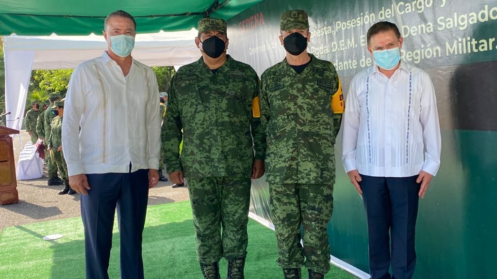 Mazatlán, Sinaloa, a 01 de julio del 2021.- En presencia del gobernador Quirino Ordaz Coppel; así como del gobernador de Durango, José Rosas Aispuro Torres, y autoridades militares encabezadas por el General de División D.E.M. Agustín Radilla Suastegui, comandante oficial mayor de la Secretaría de la Defensa Nacional, le rindió protesta al General de Brigada D.E.M. Enrique Dena Salgado como comandante de la III Región Militar, quien sustituye al General de División D.E.M. Carlos Ramón Carrillo del Villar.