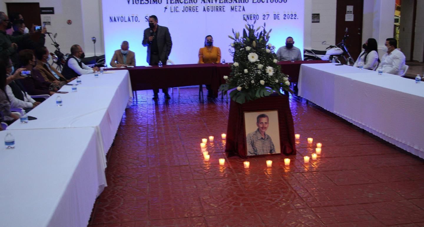 El acto cívico por el aniversario luctuoso, de Jorge Aguirre Meza se llevó a cabo en el municipio de Navolato y fue encabezado por la Alcaldesa Margoth Urrea Pérez, por familiares del homenajeado y por el profesor Óscar Loza Ochoa, fundador de la Comisión Estatal de Derechos Humanos en la Entidad.