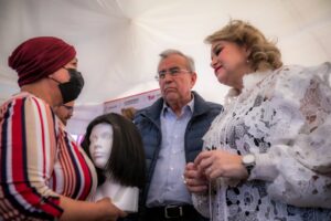 *En el evento, el mandatario estatal entregó también cuatro pelucas oncológicas para algunas mujeres que están llevando a cabo su tratamiento contra el cáncer.