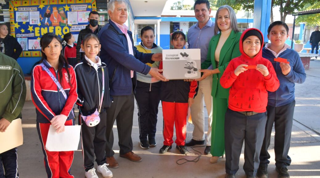 Guamúchil, Sinaloa; a 15 de enero del 2023.- El presidente municipal de Salvador Alvarado, Armando Camacho Aguilar, en compañía de su esposa, la presidenta del sistema DIF, Lupita López de Camacho, visitó la escuela primaria Ford Num. 8 General Vicente Guerrero, en donde realizó una donación de un microscopio para el aula STEM, el cual vendrá a reforzar la educación que reciben todos los alumnos de dicha institución educativa.