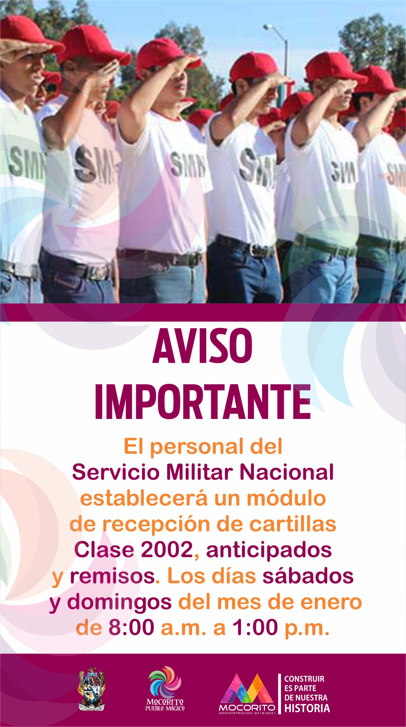 La Secretaría de la Defensa Nacional (SEDENA) ya se encuentra trabajando en los trámites para la cartilla militar en el municipio de Mocorito; en donde en coordinación con el H. Ayuntamiento, estarán atendiendo y brindando información para los interesados y ciudadanos que necesitan obtenerla.